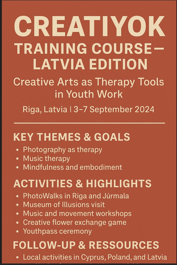 The second international training course of the CREATIYOK project – Creative Arts as Therapy Tools in Youth Work took place from September 3rd to 7th, 2024, in Riga, Latvia. The project, funded under Erasmus+ KA2 – Small-Scale Partnerships in Youth, aimed to empower youth workers with creative, therapeutic tools that can be used to support young people in their local communities.